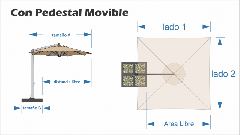 En sombrillas de poste lateral con pedestal, deberás considerar el espacio libre que existe entre el pedestal y el borde frontal de la sombrilla, en sombrillas de poste lateral con anclaje fijo, considera el area libre entre la base o poste de la sombrilla hacia el borde frontal de la sombrilla. Con estos datos y considerando el tamaño de tu mobiliario, podras definir una medida correcta aproximada para tu sombrilla.